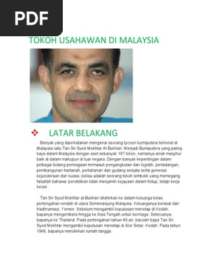 Lee Yean Wang juga dikenali sebagai Dr Mos atau Dr Nyamuk gelaran unik yang diberi kepada usahawan ini menarik perhatian ramai. Dato Sri Siti Nurhaliza Tarudin. Bagi memilih seorang tokoh usahawan yang berjaya berdasarkan contoh-contoh tokoh yang telah dipelajari Tan Sri Syed Mokhtar Al-Bukhary merupakan insan yang pengkaji pilih atas dasar kejayaan beliau dalam menjadi antara salah seorang usahawan Bumiputera yang terkaya di Malaysia.